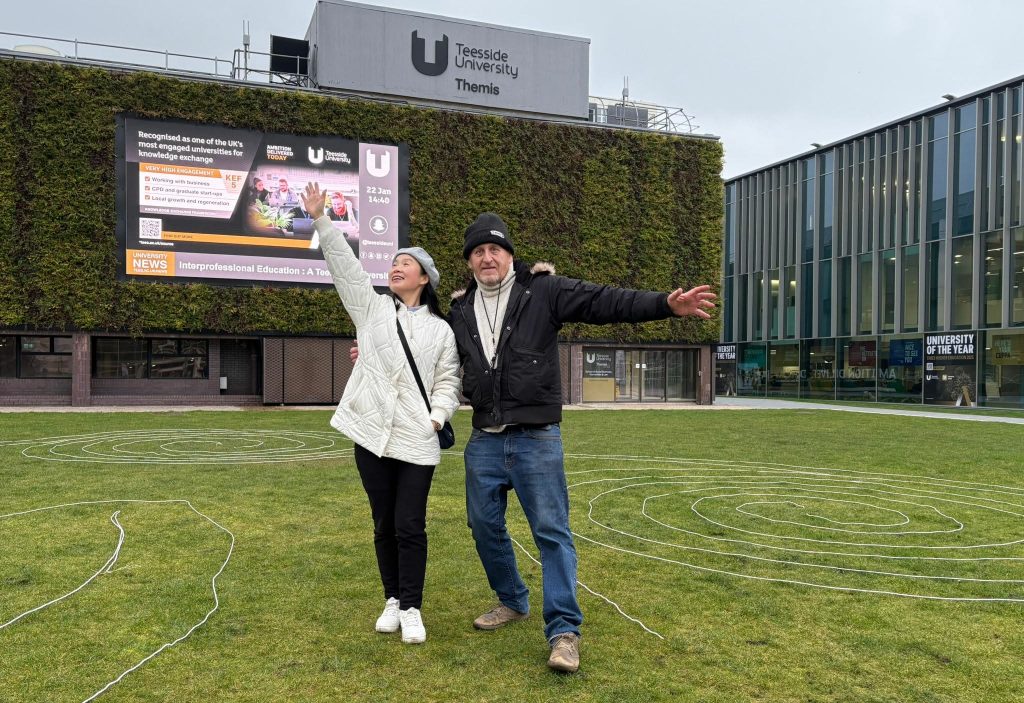 “The Magic Map” was the name given to The Rekalibrator from Lan Lan. Seeing how she wanted to become a facilitator so she could demonstrate The Rekalibrator back in her own country of China, and the reason why she was studying was to find out about The United Kingdoms teaching methods, we decided to create one on the grass within Teesside University campus. I was very happy to see the name of the university in the photo,though the word underneath the Teesside University caught my attention.